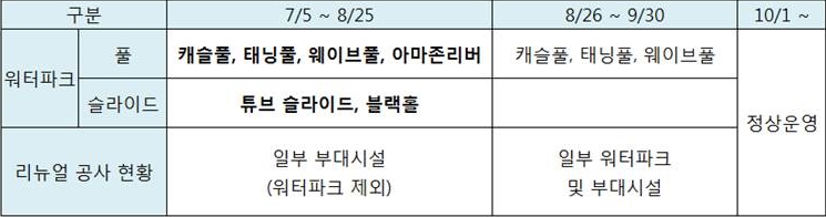기존 7월 20일 이후 오픈 예정이었던 월드리조트 워터파크의 시설이 7월 5일 조기 오픈되며,